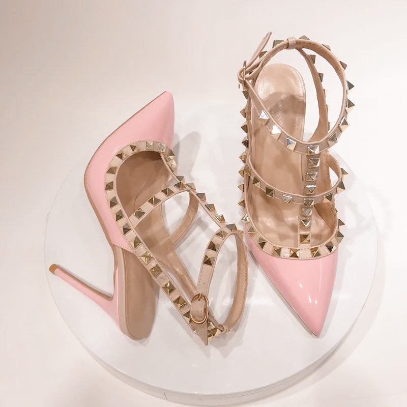 - Gold studded details on each heel