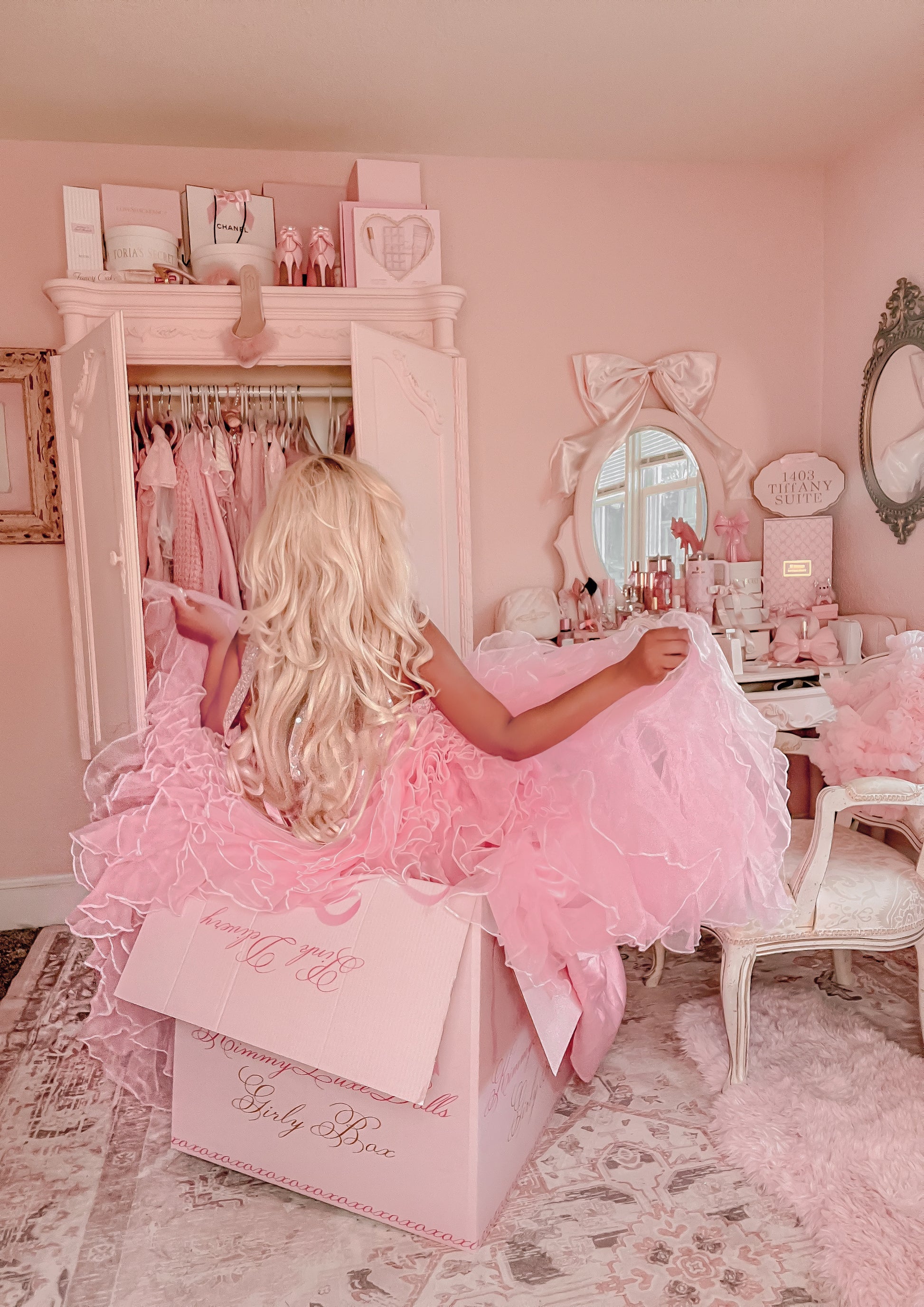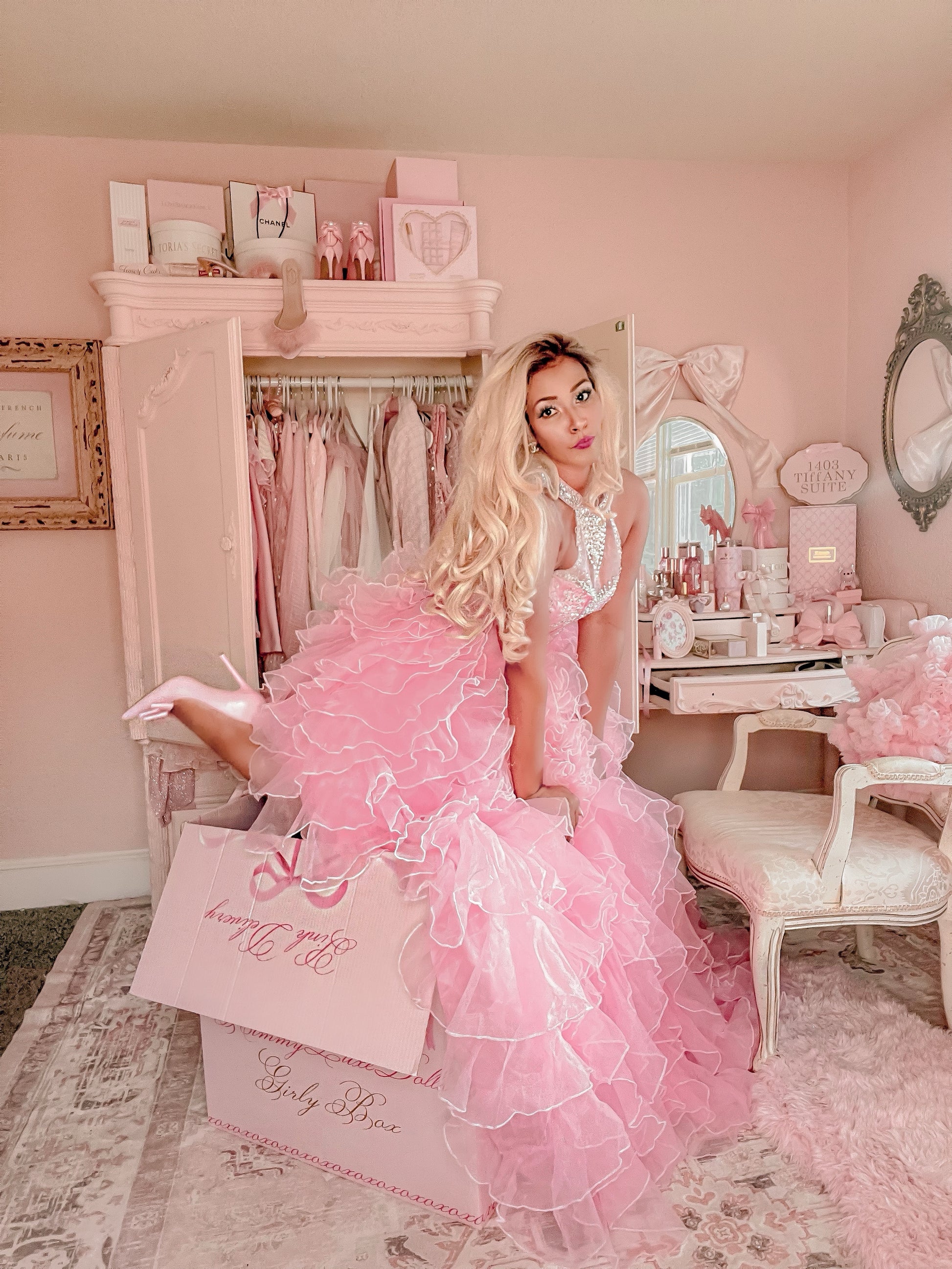 Get ready to sparkle in this iconic anniversary celebration dress! Crafted to honor seven fabulous years of KimmyLuxeDolls!!! This showstopper arrives in dreamy Barbie pink with dazzling crystals hand-sewn across the bodice. The romantic lace corset ties deliver elegance while those lush, endless ruffles guarantee maximum drama and shimmer with every step. Whether you're dancing, twirling, or simply making an entrance, you'll radiate pure princess energy in this unforgettable gown.