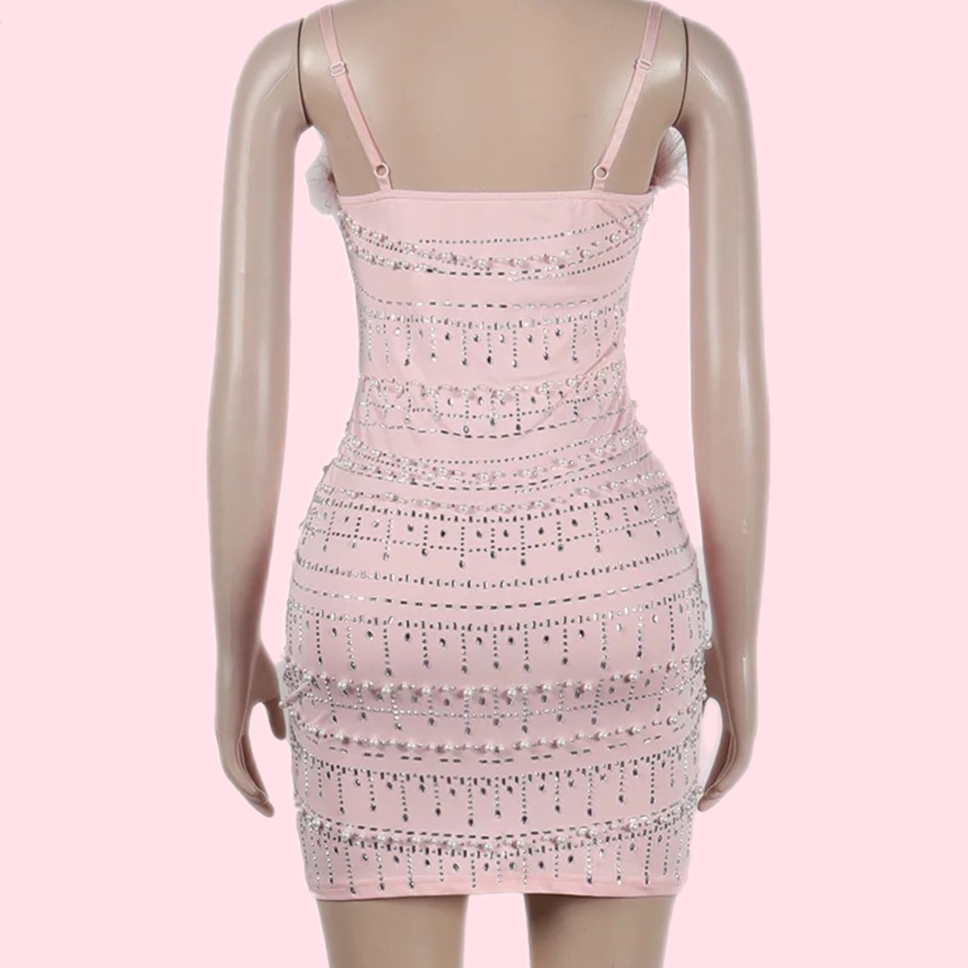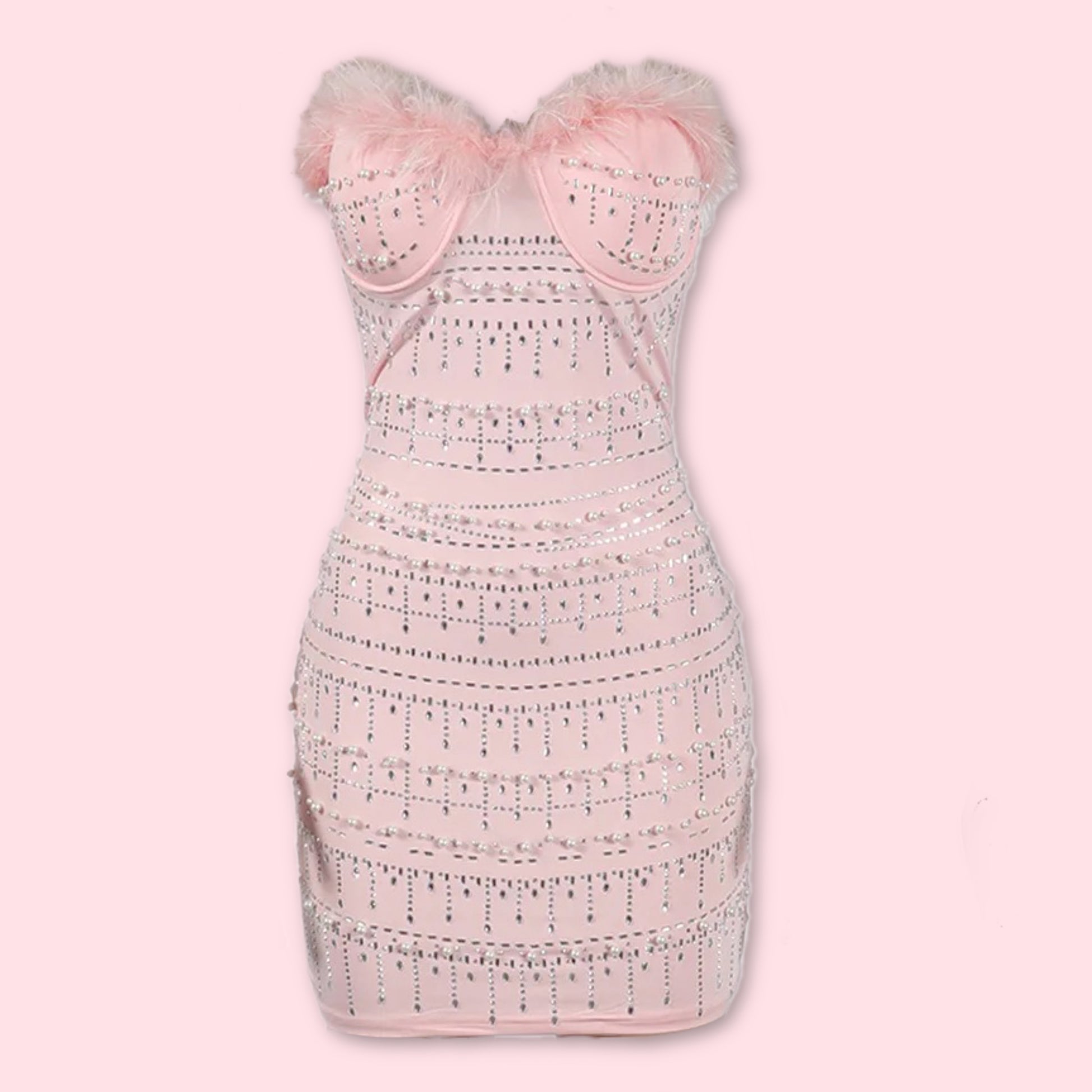 Enhance your wardrobe with this stunning Sparkle en Pink dress! Embellished with crystals, feathers and dazzling pearls! Ideal for a special occasion, this dress exudes style and glamour. Complete your look with a pair of sparkling heels and a touch of lip gloss, and prepare to steal the spotlight as the ultimate queen of glamour. Whether it's a romantic date or a night out with the gals, you'll turn heads and feel like a true goddess.