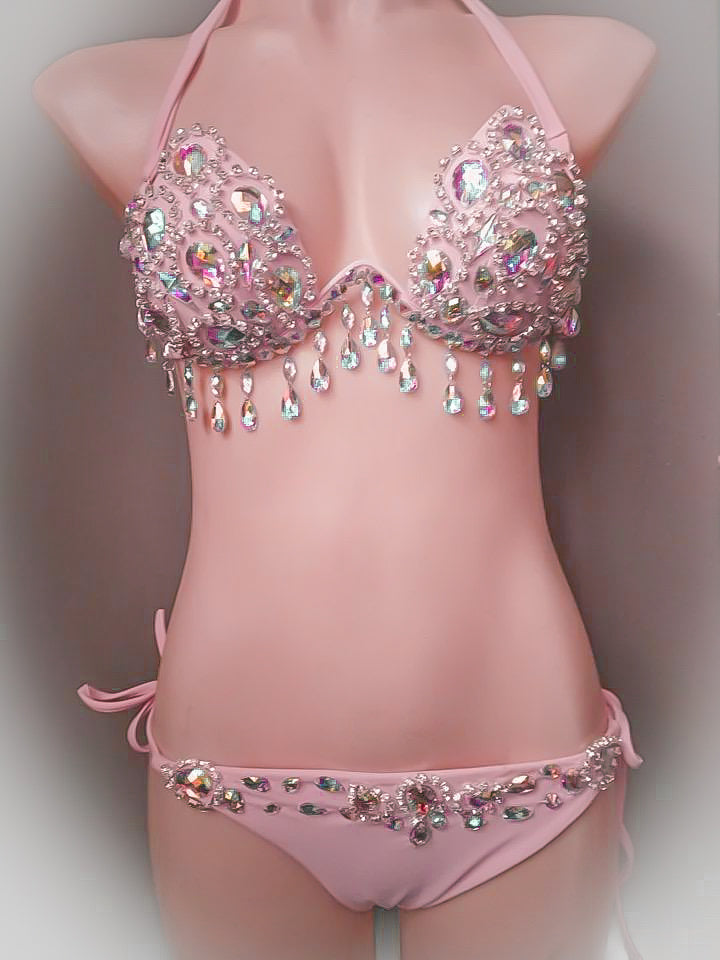 Indulge in luxury with this one of a kind handmade crystalized bikini, perfect for turning heads at your next yacht party this summer. Choose your specific bra size for the perfect fit. While it may be tempting to wear this stunning piece in the water, it is only meant for photography and pairs beautifully with the adjustable strap crystal cover up. Feel confident and stylish with this must-have addition to your summer wardrobe!